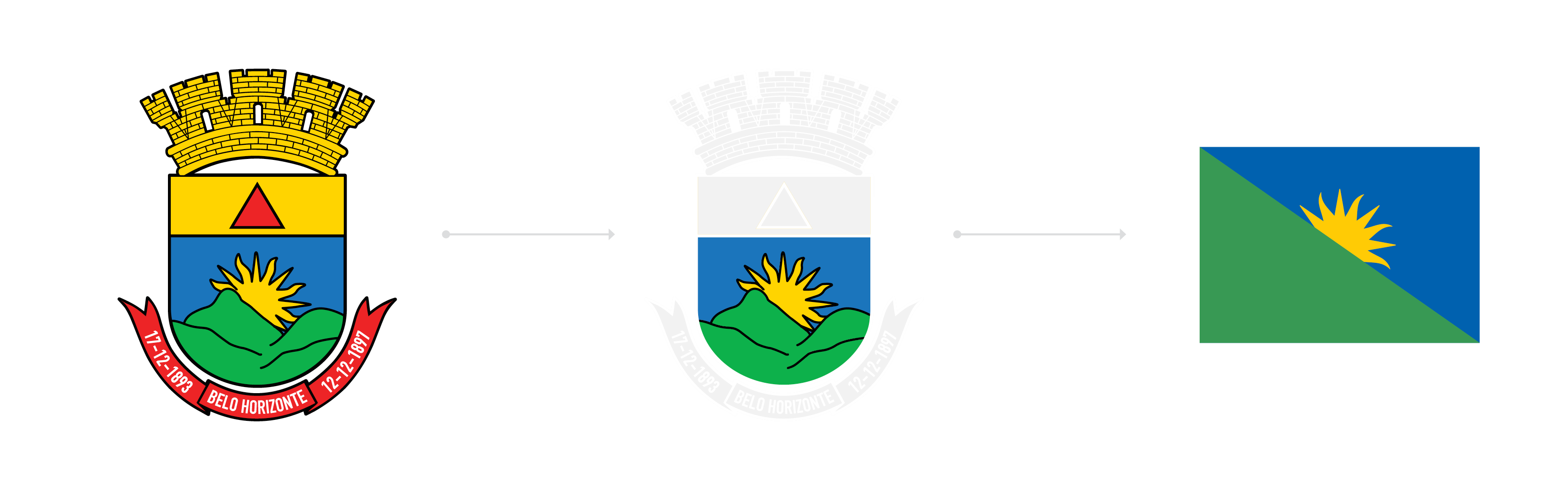 Ao simplificarmos o brasão, tirando dele todas as informações que não são relevantes para uma bandeira, ficamos somente com os elementos que realmente representam a cidade: o Céu, o Sol, e a Serra, formando o tal do belo horizonte que dá nome ao município.