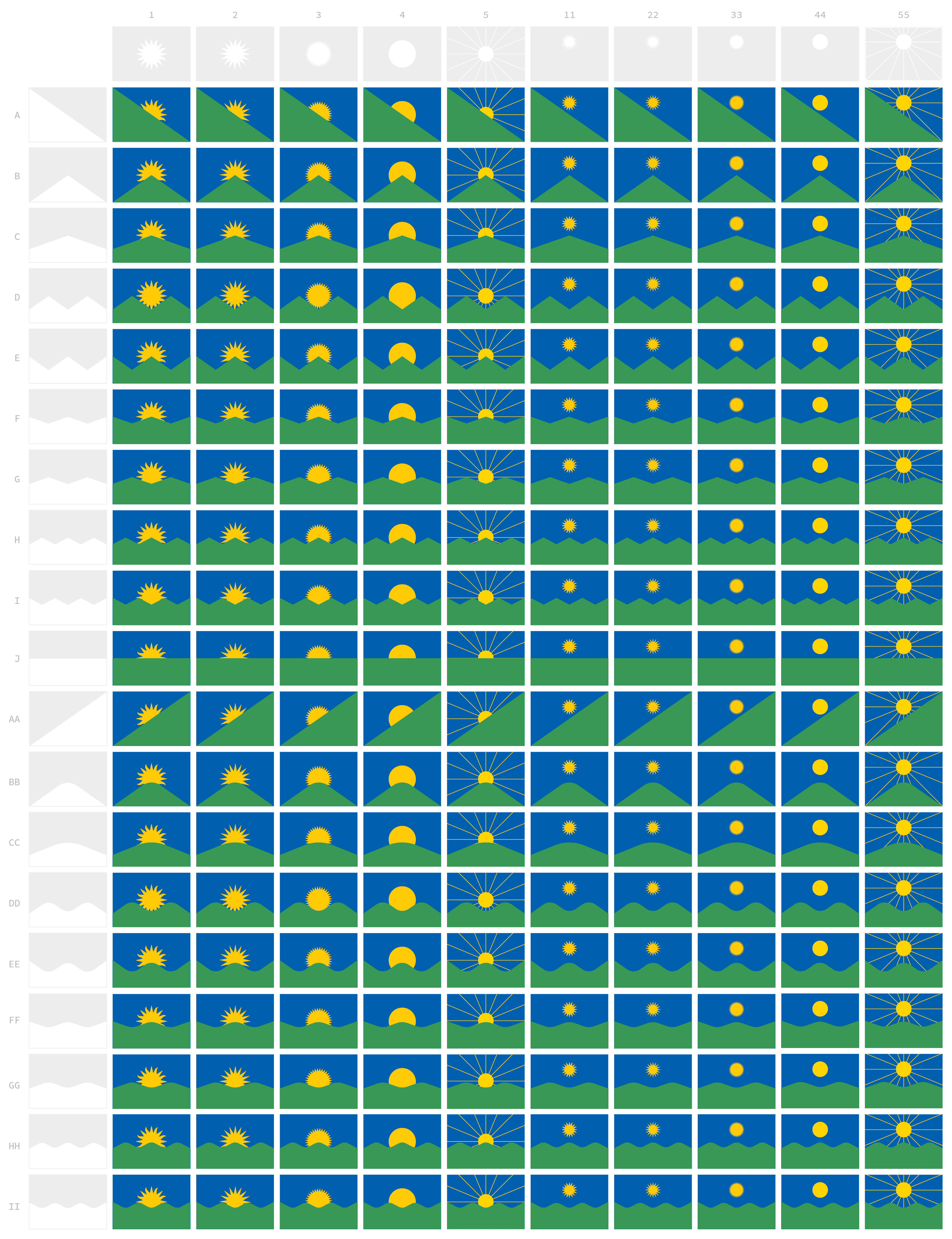 Dentre todas as alternativas geradas, ressalto algumas das favoritas, com seus pontos positivos e negativos. A GG22 se saiu bem no quesito ‘representar o pôr do sol na serra’, mas acabou ficando um pouco pictórica demais para ser bandeira. A J22 possui uma ‘bandeiridade’ excelente, mas a linha reta dá margem para que a serra seja interpretada como ‘planície’. No fim das contas, não por acaso, a escolhida foi a versão A1, que mistura (A) uma representação abstrata de ‘serra’ simples o suficiente para ser desenhada por qualquer pessoa com (1) um sol baseado no desenho presente no próprio brasão da cidade, mantendo uma relação forte entre os seus dois principais símbolos oficiais.