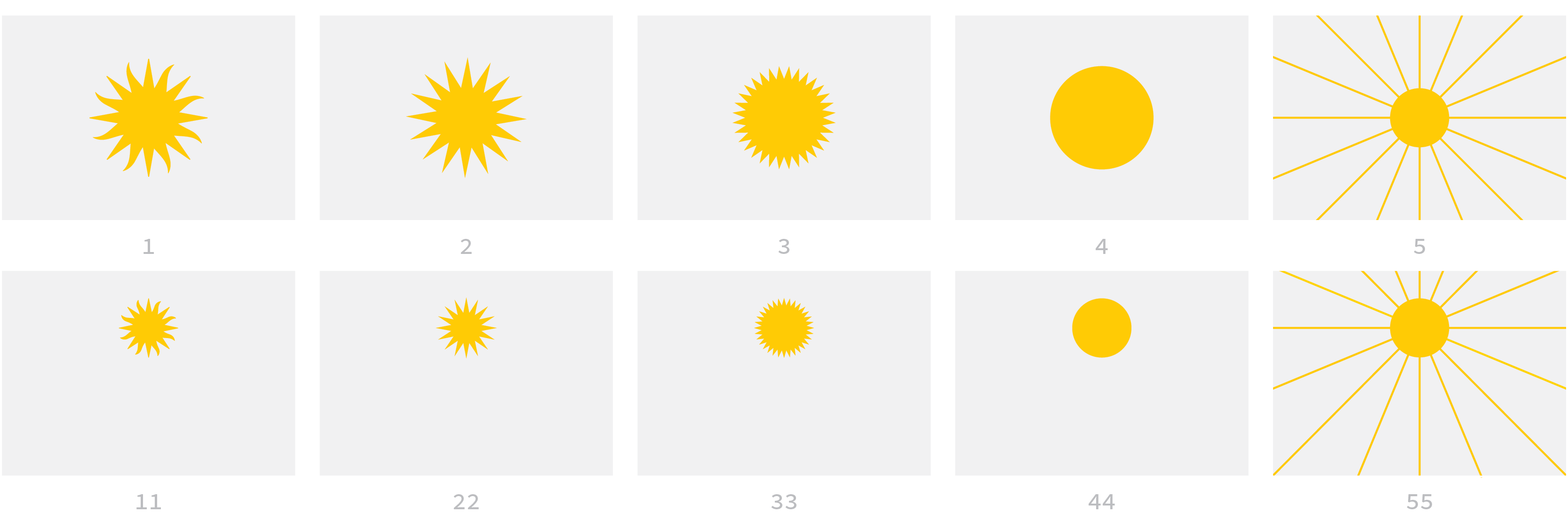 O desenho 1 é uma atualização do desenho do sol presente no brasão atual, com ajustes para que tanto os raios de sol curvos quanto os retos tivessem o mesmo peso aparente. O 2 mantém a mesma estrutura do 1 (16 pontas), mas com um desenho mais geométrico que facilita sua reprodução. O 4 é uma simplificação extrema do sol (como ocorre na bandeira do Japão, por exemplo), enquanto o 3 um meio termo entre ela e o anterior. O 5, por último, é uma atualização simplificada do desenho presente nas versões mais antigas do brasão.
