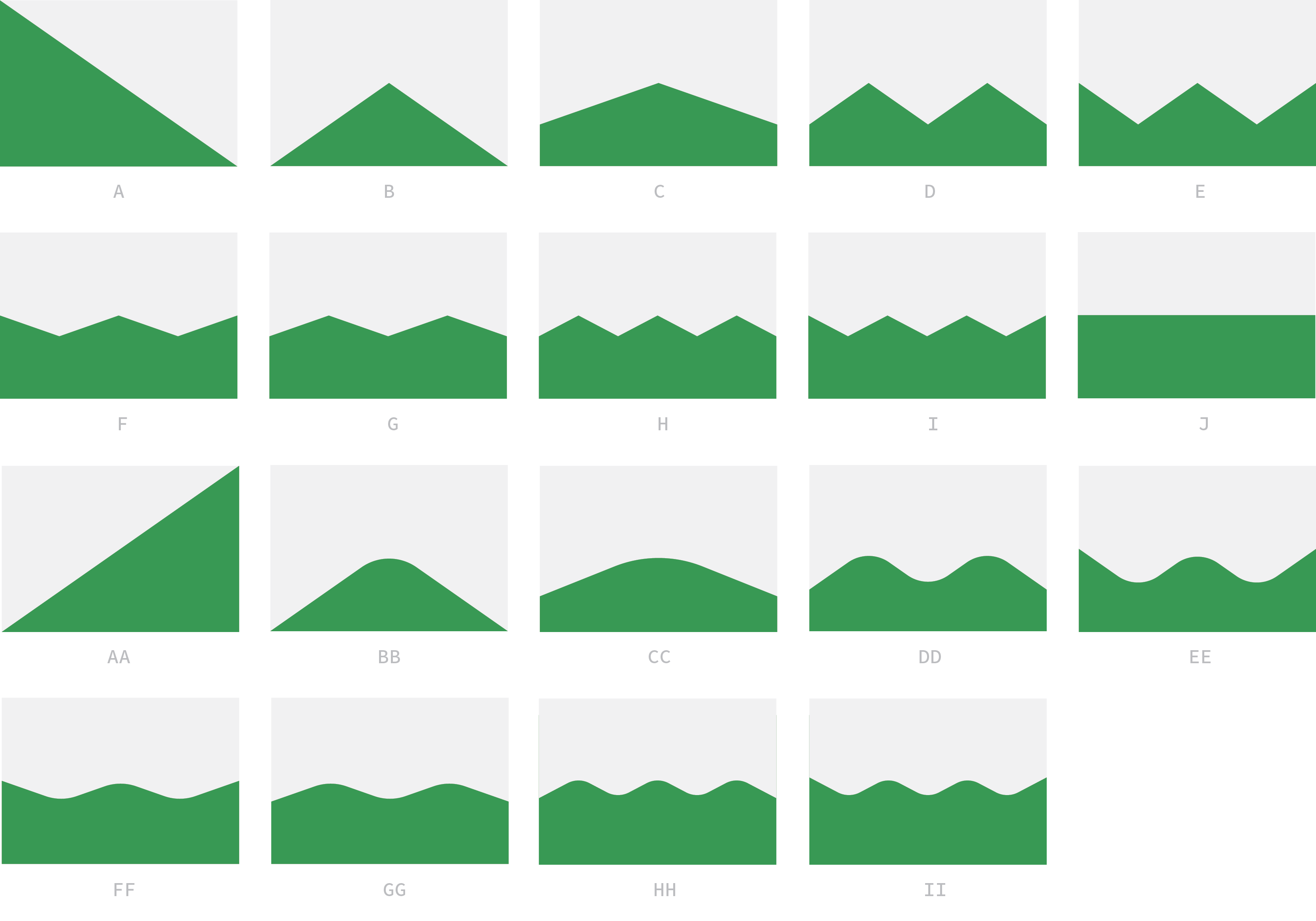 De início, na letra A, temos a representação mais simples da idéia de serra / montanha / aclive. Entre B e E, temos variações na quantidade de ‘picos’, enquanto entre F e I a mesma variação é repetida, porém com alteração no tamanho dos seus ‘vales’. Por fim, na letra J, uma representação mais próxima da idéia de ‘horizonte’, que acaba deixando a idéia de ‘serra’ em 2º plano.